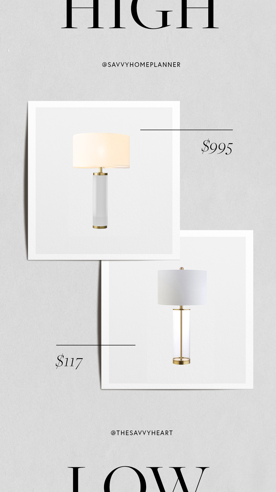 The next dupe that I have to share with you is a glass table lamp, which is a very timeless style that could go either in a very traditional or modern style room. The high-end version from Restoration Hardware cost almost $1000, but I found a very similar lamp that only cost slightly over $100. They are both similar in size and come in around 30 inches tall. However, the budget friendly option only comes in a brass / gold finish.