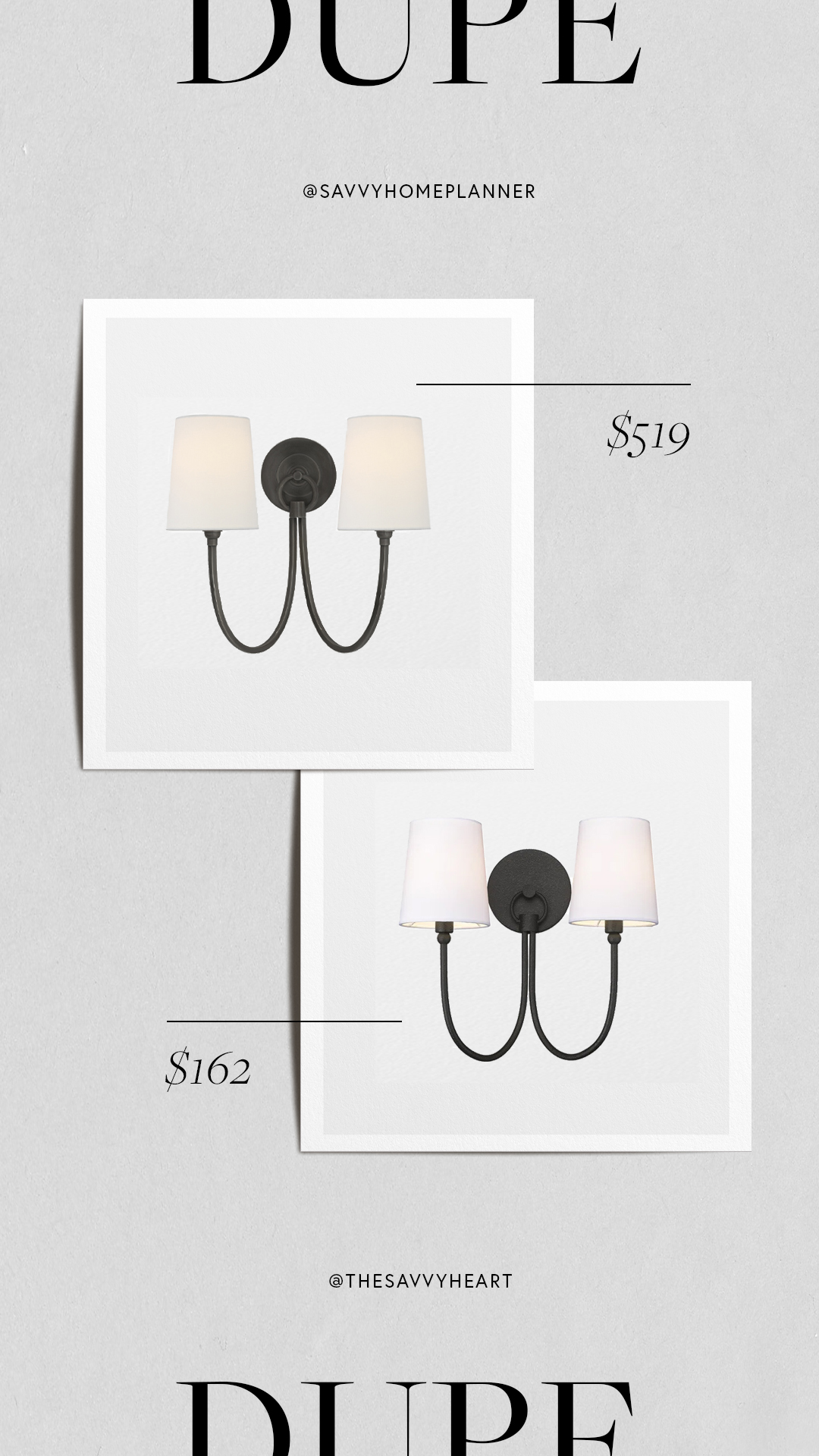 Here is a dupe for this beautiful double-light sconces with an elegant swoop design. The high-end version retails for about $500, but the dupe I found costs only $200. The best part is that the dupe has the same quality and size as the high-end version. Both have the same dimensions and are made of the same materials.