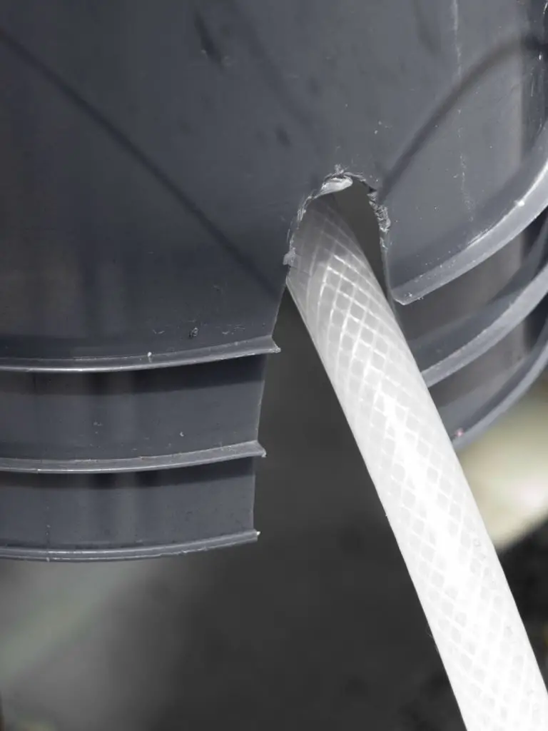 - Modify a plastic bucket to fit the tubing and brass pipe.