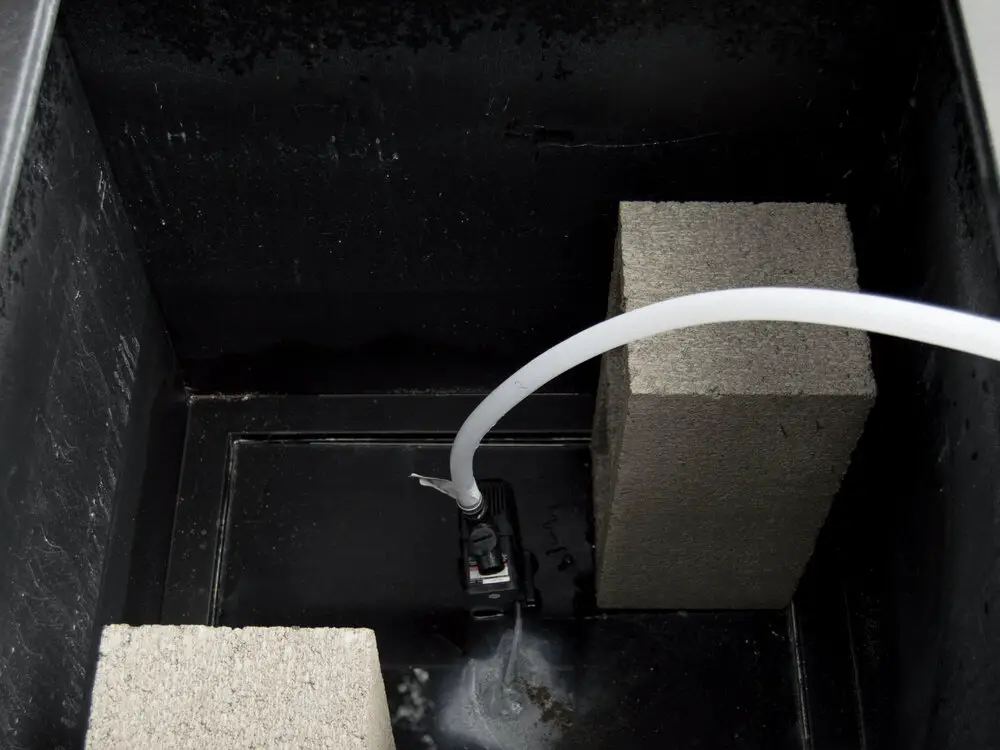 Decide where you’re going to place the fountain pump. A corner spot is easy to access once everything’s built, but depending on how you set yours up, that might not be an option. In my case, since I have cinder blocks in the corners, we placed our fountain pump in the middle. Once you have the fountain pump in place, use J-B Weld to form a seal between the hole and the cord, making it water tight. We used the J-B Weld Steel Stik as it adheres to metal and is made to get wet. We did an extra layer of spray flex seal, just for good measure. We want this thing to be watertight!