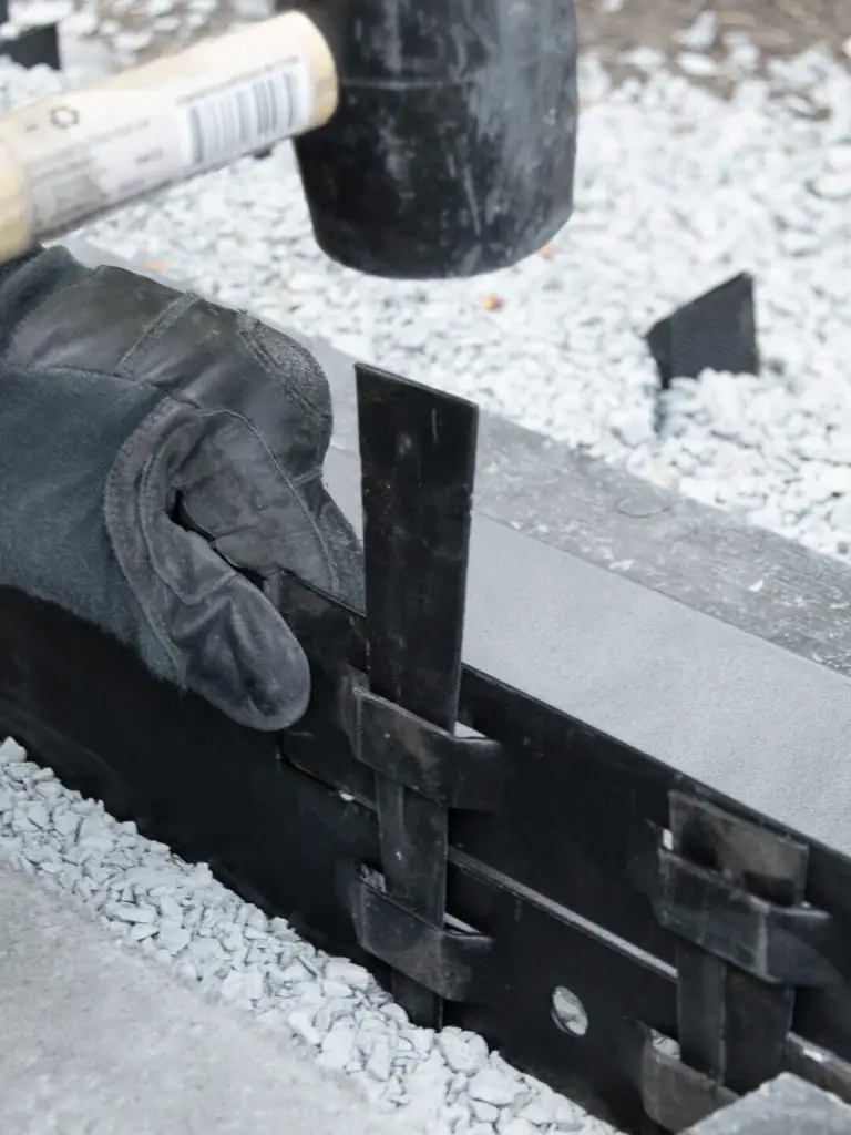 To install the edging, use a hacksaw or mini circular saw like we did, and cut it to size. Then fit the pieces together to create one continuous line or use a 90 degree elbow to create a square or rectangle and secure them in place with a rubber mallet and steaks.