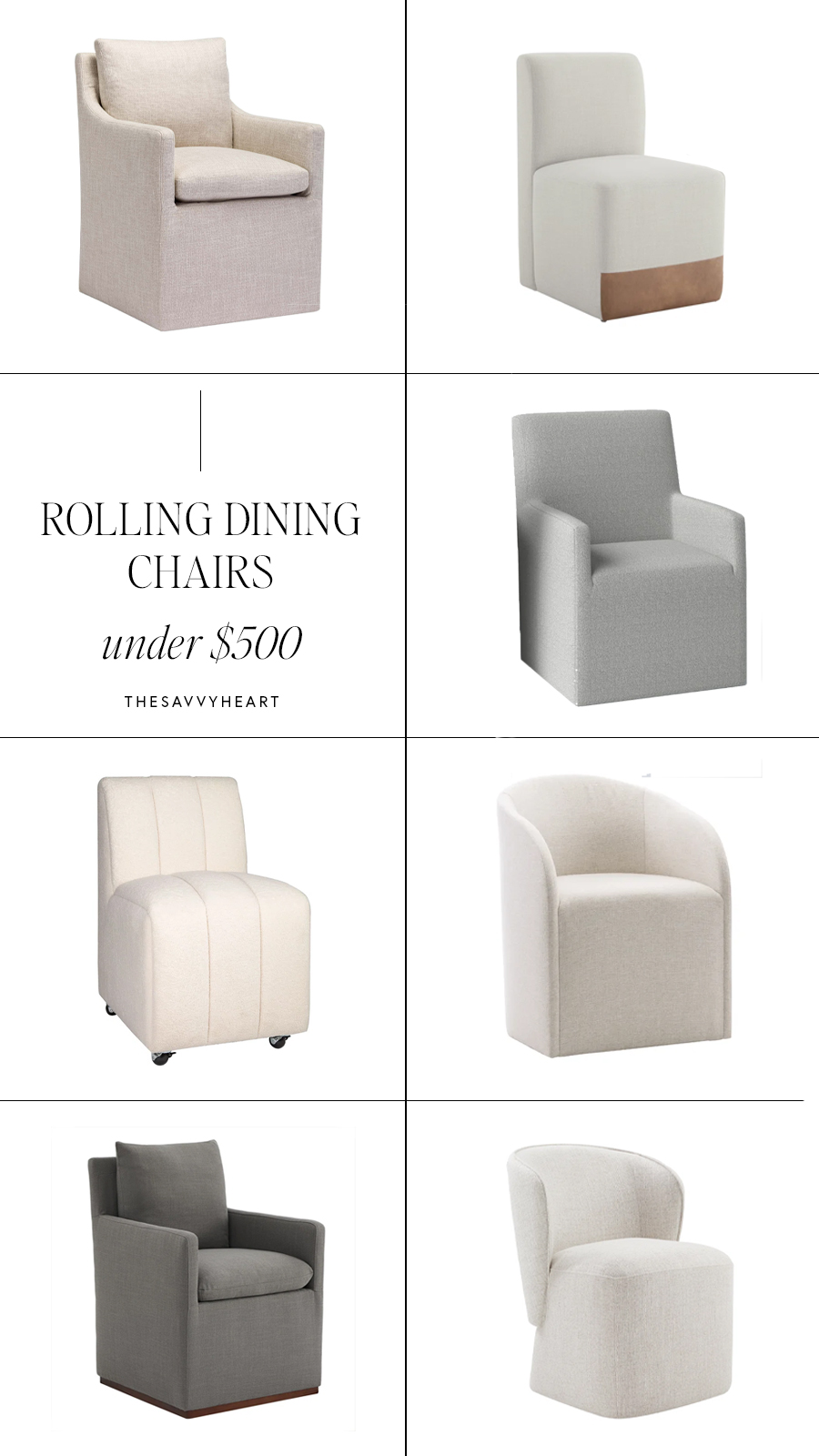 If you aren’t familiar with savvy favorites, I search high and low to find the best pieces for you at three different price points. For this post, I rounded up rolling dining chairs under $500, $750, and $1000, so you can find something within your budget!